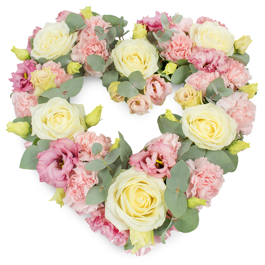 Delve into the beauty of remembrance with our serene tribute floral design. Every element has been thoughtfully chosen, from the fresh, hand-selected blooms to the artful arrangement that conveys both comfort and gratitude. White roses, pink carnations, and pink lisianthus come together harmoniously, accented by the gentle green of eucalyptus leaves.
